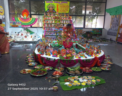 Content : Our Students came together to celebrate the vibrant festival of Navarathri, a time that honors the triumph of good over evil and celebrates knowledge, music, and culture. A Golu arrangement with dolls was displayed, and the children eagerly participated in offering flowers, singing simple bhajans. The rhythmic beats of music and cheerful voices filled the atmosphere with joy.