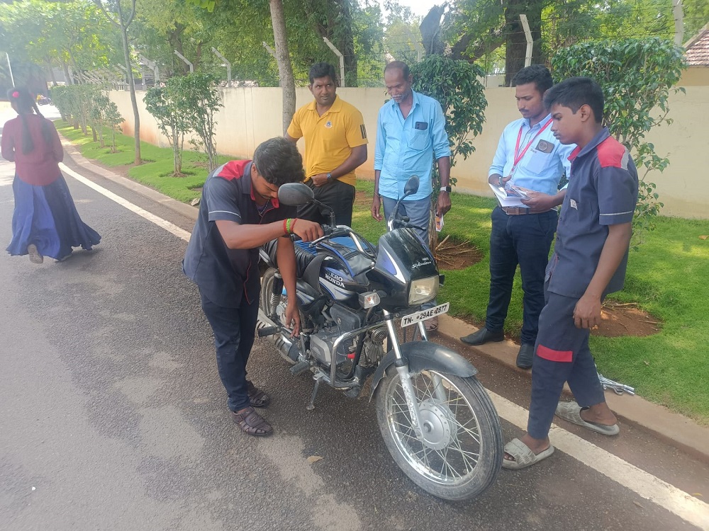 Activity 2: The RSP Club Outreach program conducted on 11.10.2025 (Saturday) with the club of 17 members and took part in the outreach program held in school campus. They conducted a vehicle check to the parent's vehicles. They performed this in collaboration with Krishna Hero Motocorp, Dharmapuri. They conducted oil check, engine smoke, control cable, breaks. Parents enthusiastically participated and more than 75 two wheelers where checked.