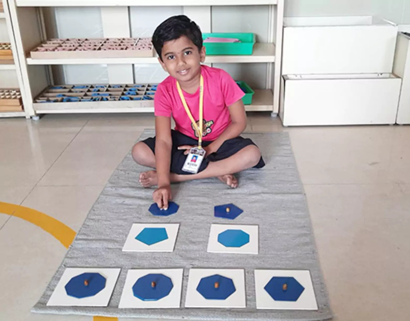Geometric lessons help develop the child’s visual discrimination in shape and form. Additionally, a child develops the ability to observe progression from concrete to more abstract forms, all while the child learns the various figures. Indirectly, these lessons prepare the child for writing.