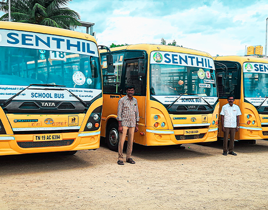 The Teachers accompany the students in the buses to maintain discipline & safety. All the buses / Vans have fulfilled Government regulatory standards. Trained drivers and helpers are provided for every bus/van for the safety of students. The transport service is safe and secure and will pick up and drop students at specified stops only. The transport fee is collected for 11 months per year and is not refundable. Charges for transport are in accordance with the distance. This is reviewed from time to time and charges are subject to change depending on the prevailing fuel prices.